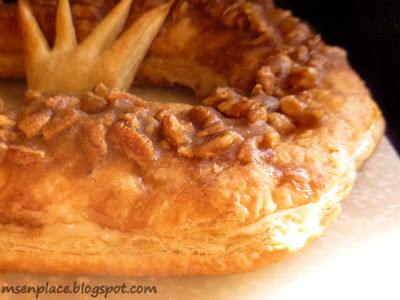 It's a traditional French style King Cake...Galette des Rois. Made with puff pastry and often filled with almond paste, this type of King Cake has a more subdued look. But with puff pastry, Praline pastry cream filling, and praline topping, it's anything but subdued in flavor.