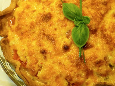 The basic recipe: chives scattered in a pie shell. Topped with sliced tomatoes seasoned with salt, pepper, and basil. Spread with a mixture of mayo and sharp cheddar (which skeeves me out if I think about it too much, but it's actually really good.)